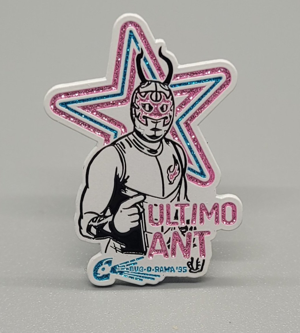 These 1.5" tall pins feature a version of the Jesse Justice X Ultimo Ant art available in other forms around the site. These pins feature pops of color with GLITTER flakes to be sure to catch passerby's eyes. Collect yours here, or in-person at an upcoming appearance!
